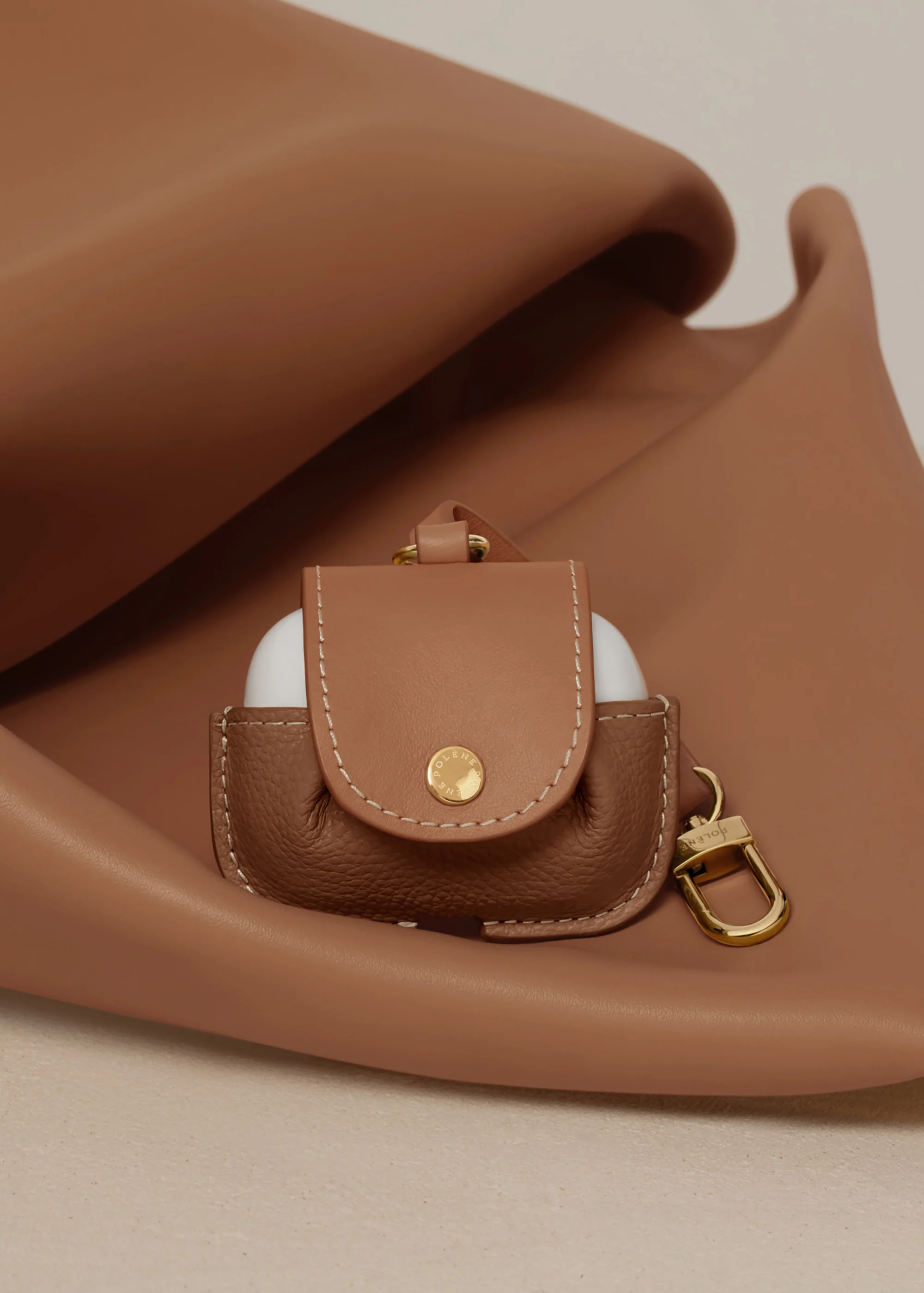 Made from upcycled Polène leather offcuts, the “Numéro Un” AirPod case plays on the iconic codes of the brand’s flagship bag, with its folds held in place with hand-sewn stitches and its half-moon flap. It closes with an engraved snap fastener and is held together by a key ring. Accommodates 3rd generation AirPods and 2nd generation AirPods Pro.