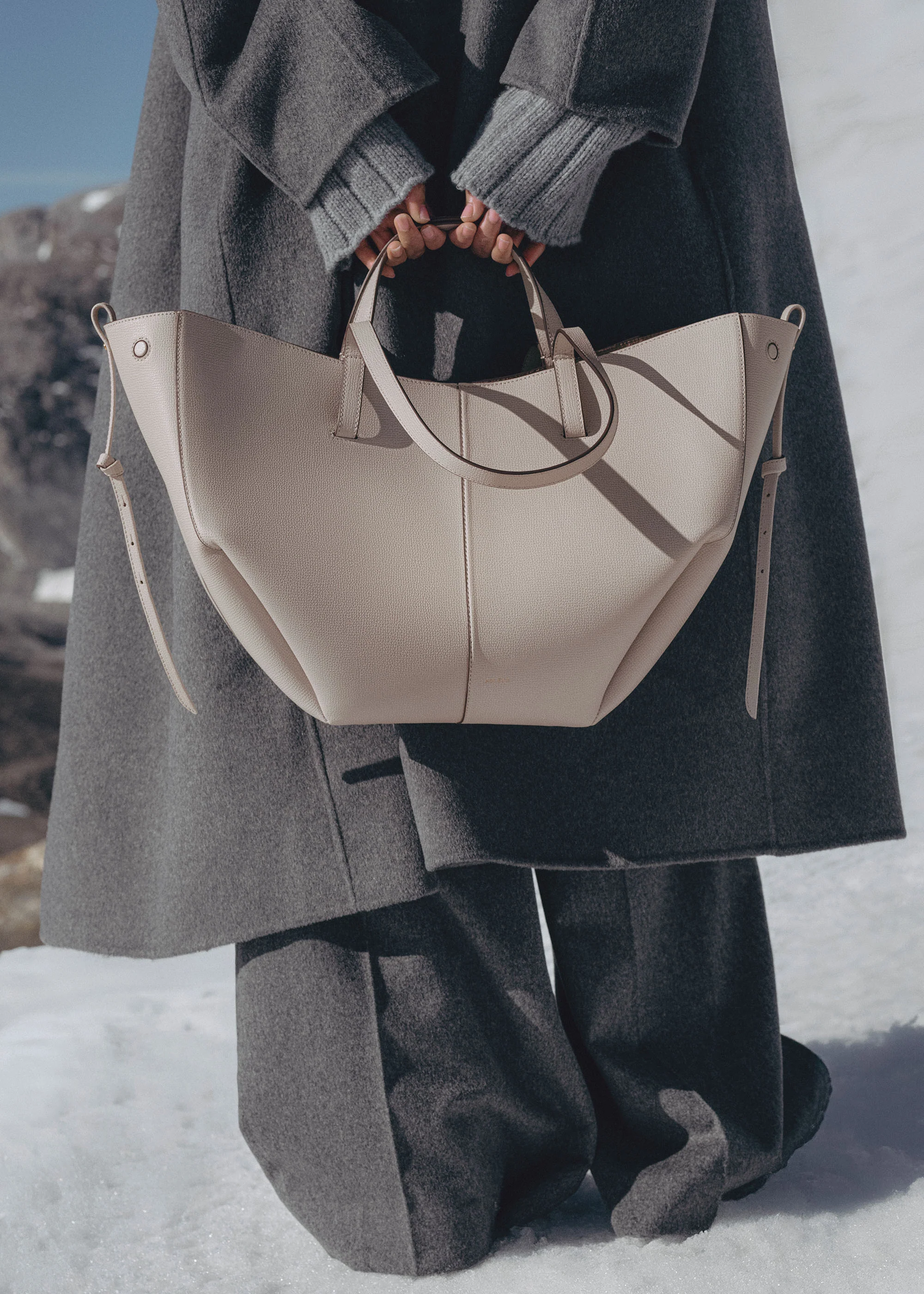 This sculptured tote bag featuring waves, folds, and curves can be used in two ways. The first is a basket, its sides open, its straps on the outside. The second is a floral, closed bag, its sides tucked in, its straps crossing on the inside. Its name was inspired by the French word “cime”, meaning a peak or mountain crest, in reference to the ridge running along it.