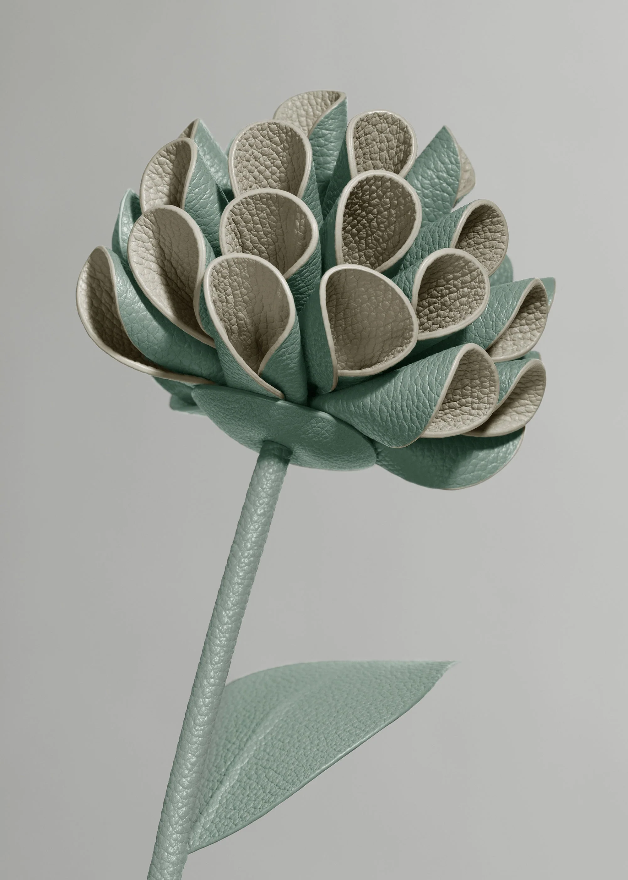 From the Plèi collection and made entirely from upcycled leather offcuts, the “Dalium” flower was inspired by the sculptural geometry of the dahlia. The tubular petals created in two contrasting colors of leather are meticulously assembled with a folding and stitching technique. Hand-sewn ribbed leaves adorn the slightly curved leather-covered stem. This flower can be displayed in a bud vase, with other leather flowers, or in a bouquet of dried flowers. The name “Dalium” is a play on “dahlia”, underscoring the creative reinterpretation of this leather version.