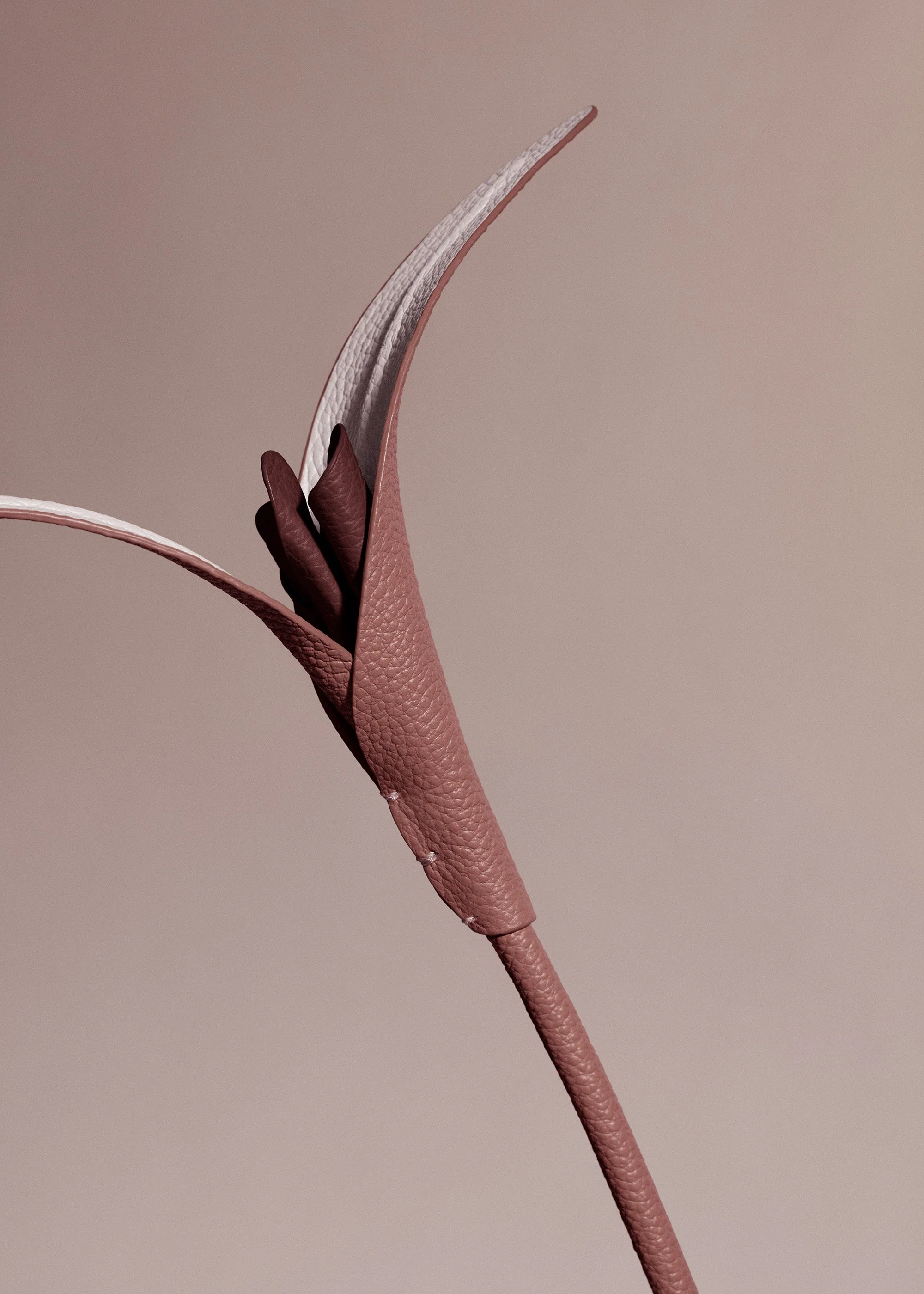 From the Plèi collection and made entirely from upcycled leather offcuts, the “Touka” flower is fashioned in three different hues of a single color. Its clean lines were inspired by the bird of paradise. Two asymmetric flowers have curled inner petals. Hand-stitched ribbed leaves subtly conceal the point where their leather-covered stems meet. This flower can be displayed in a bud vase, with other leather flowers, or in a bouquet of dried flowers. The name “Touka” is a play on the word “toucan”, echoing the bird of paradise flower which served as the inspiration for this piece.