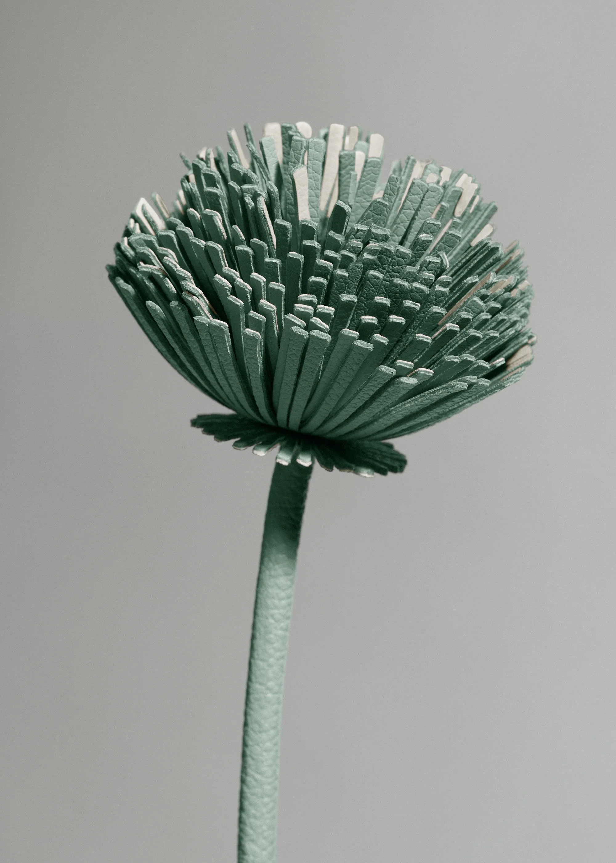 From the Plèi collection and made entirely from upcycled leather offcuts, the “Tul” flower can be recognized by its airy shape. Its two-toned leather petals are made using special molds. The point where the two leather-covered stems come together is enveloped in a long ribbed leaf, held in place by delicate hand-sewn stitches. This flower can be displayed in a bud vase, with other leather flowers, or in a bouquet of dried flowers. The name “Tul” is a play on the word “tulle”, echoing the wispy effect of the collection of fringe-like petals.