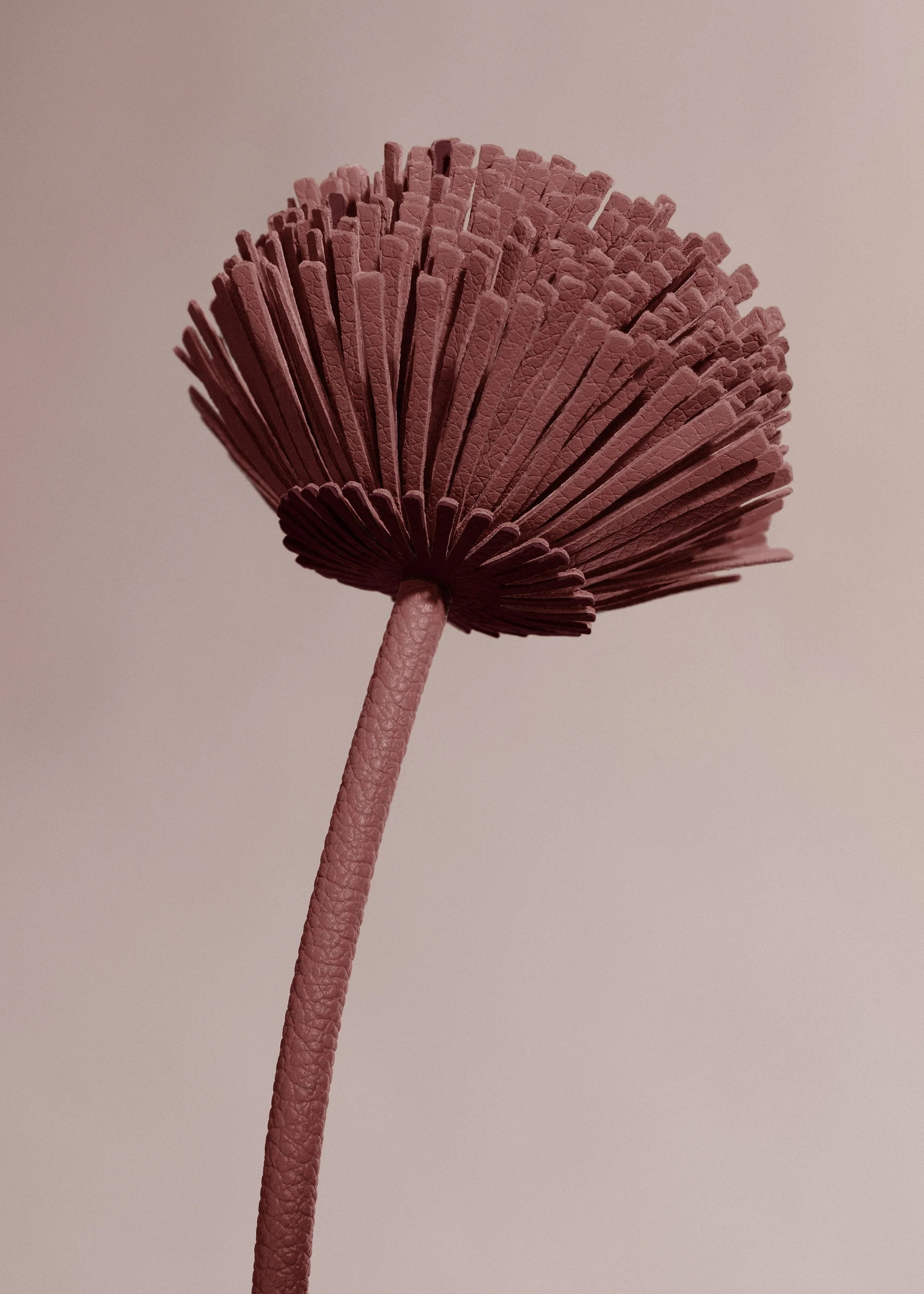 From the Plèi collection and made entirely from upcycled leather offcuts, the “Tul” flower can be recognized by its airy shape. Its two-toned leather petals are made using special molds. The point where the two leather-covered stems come together is enveloped in a long ribbed leaf, held in place by delicate hand-sewn stitches. This flower can be displayed in a bud vase, with other leather flowers, or in a bouquet of dried flowers. The name “Tul” is a play on the word “tulle”, echoing the wispy effect of the collection of fringe-like petals.